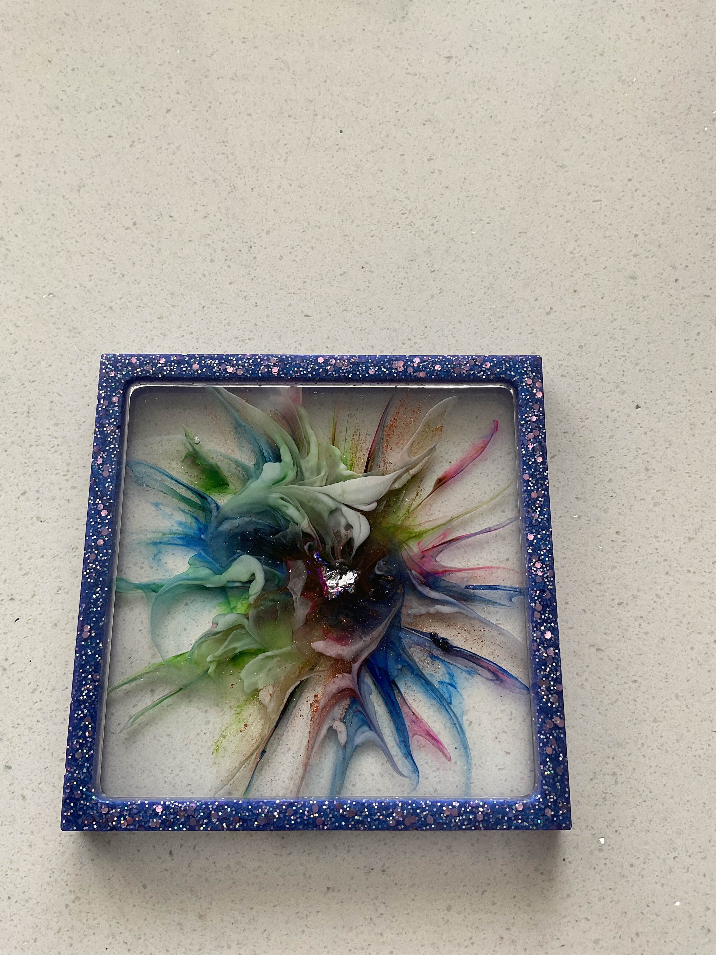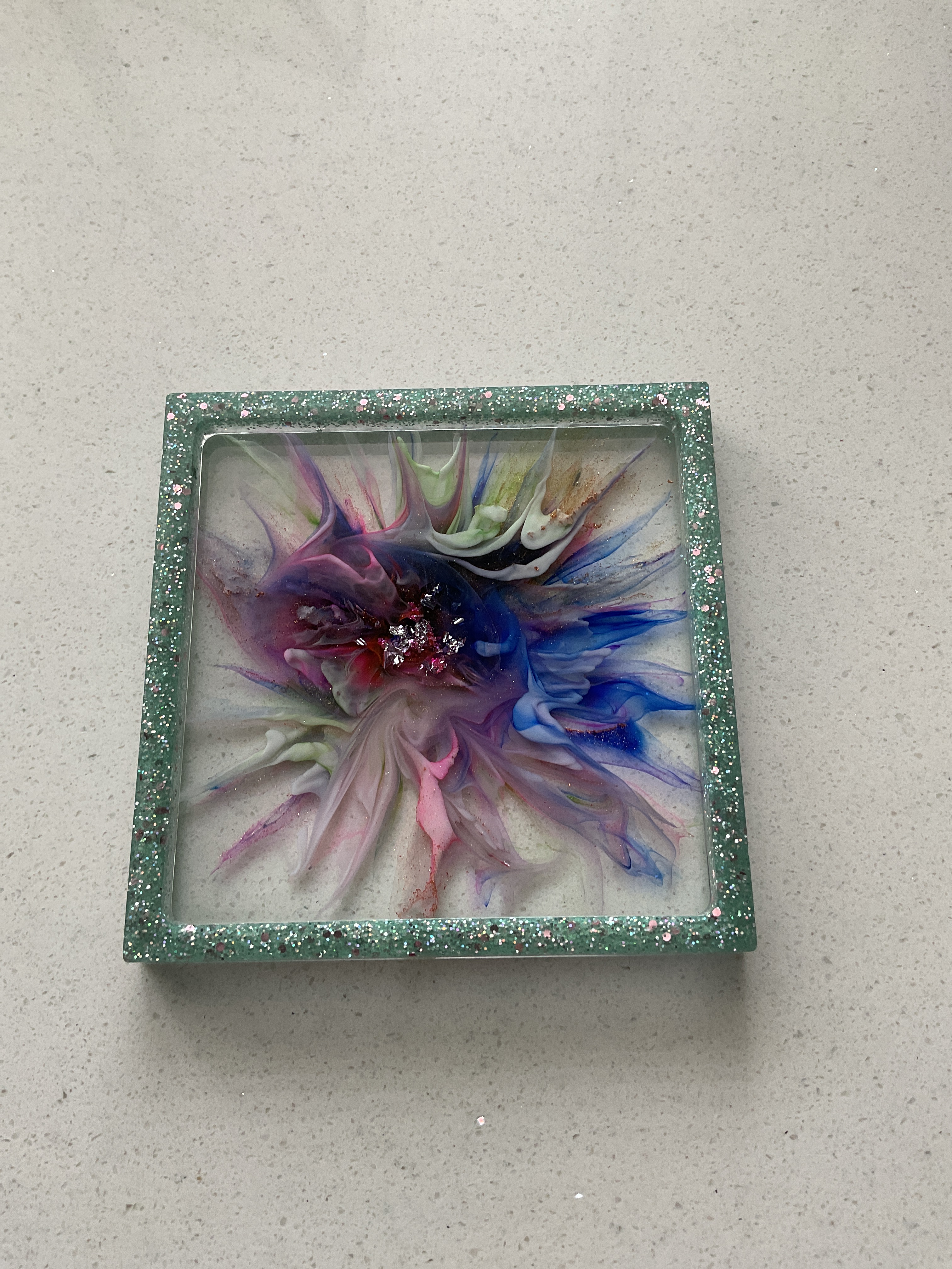 Measuring 10cm x 10 cm these beauties have been crafted from high quality epoxy resins and alcohol ink. Casted in two layers they have taken approximately 36 hours to create.